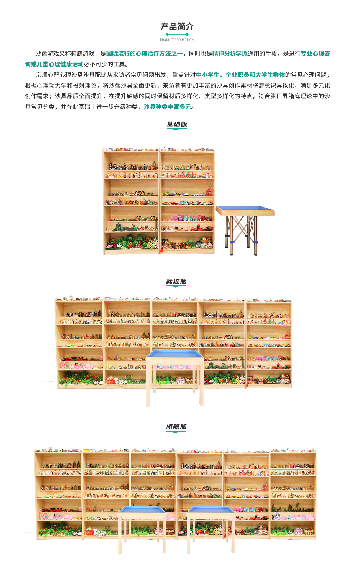 京师心智心理沙盘沙具配比从来访者常见问题出发,重点针对中小学生、企业职员和大学生群体的常见心理问题,根据心理动力学和投射理论,将沙盘沙具全面更新,来访者有更加丰富的沙具创作素材将潜意识具象化,满足多元化创作需求;沙具品质全面提升,在提升触感的同时保留材质多样化、类型多样化的特点,符合张日昇箱庭理论中的沙具常见分类,并在此基础上进一步升级种类,沙具种类丰富多元。